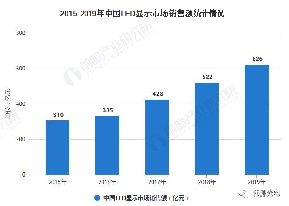 其中,LED显示应用经过了四轮的发展,成为了LED下游第三大应用市场,2019年LED显示屏应用占比达到17%。而根据中国LED显示应用行业协会发布的数据显示,LED显示销售额突破600亿元。