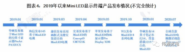 2019年,MiniLED显示迎来了规模商业化元年,京东方、群创、海信、TCL、华硕等企业纷纷推出MiniLED终端显示产品。MiniLED自发光是小间距LED的升级。由于MicroLED目前技术还存在着较大难度,因此MiniLED也被业界称作是MicroLED的过渡。