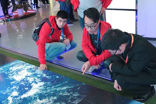 有心了解产品,自然不拘一格,面对防水镀膜地砖屏,大家见猎心喜,或脚踩或手摸,或站或蹲,交谈甚欢。整个展厅人流如织,热闹非凡。