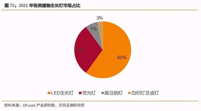LED 植物照明为发展方向,市场前景广阔。LED 植物照明指使用 LED 植物生长灯或 LED 植物照明系统,满足植物光合作用所需光照条件,属于人造光源。以光效高、光质丰富、发热低、体积小、寿命长、可调制组合、智能可控、环保节能等诸多优点,在植物照明领域优势明显。目前市场上 LED 植物照明装备种类较多,有 LED 植物生长灯、LED 植物生长箱、驱杀蚊虫 LED 灯、宅用 LED 植物灯等,预计 2021 年 LED 生产灯占各类植物生产灯的 60%,发展空间大。