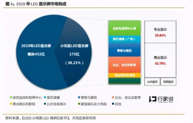 根据《2020 小间距 LED 调研白皮书》,2019 年 LED 显示屏市场的专业显示、商业显示、公共显示和民用显示的占比分别为 35.84%、53.76%、8.67%和 1.16%。专业显示和商业显示依然是 LED 的支柱型应用场景,以大尺寸 TV 为代表的民用显示仍然处在发展阶段。