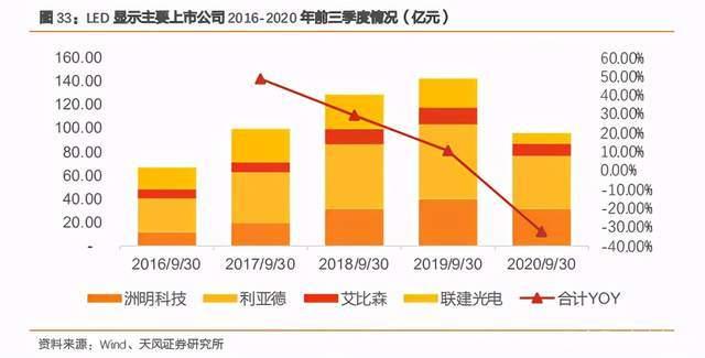 今年以来,由于受到疫情影响,2020 上半年中国大陆商显市场整体下滑明显,同比下降21%。各细分领域均呈现不同程度下滑,其中教育、服务、地产、交通受疫情影响较为严重。根据主要的 LED 显示上市公司数据来看,2020 年 1-9 月,LED 显示屏收入为 96.13 亿元,同比下滑 32.43%,其中因联建光电剥离广告业务,同比数据存在较大非 LED 显示行业因素,若不考虑联建光电,主要的 LED 显示屏上市公司 2020 年 1-9 月收入为 87.18%,同比下滑 35.14%。