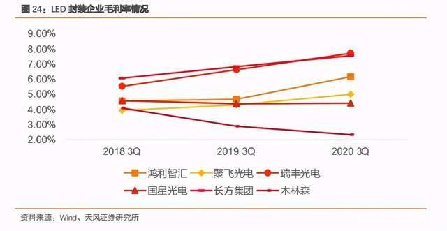单季度看,2020Q3 LED 封装主要公司收入环比增 25.10%,同比减少 6.87%,主要因疫情国内回暖,复工良好,同时,海外 LED 企业停工,订单流入国外,三季度 LED 封装企业环比回暖。木林森三季度业务包含成品收入,若不考虑木林森收入,国星、鸿利智汇、瑞丰光电等封装公司 Q3 收入为 30.16 亿元,环比增长 10.64%,同比增长 6.44%。