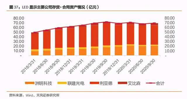 从存货来看,主要的 LED 显示公司存货由 2020Q1 下降 30.31%,主要因会计准则变化,部分已完工未结算的资产被计入合同资产科目;若假设四家 LED 显示企业新增合同资产皆为存货转入,四家公司存货与合同资产截至 Q3 合计为 69.37 亿元,较 2019 年末有所增长,较 2020Q1 末有所下滑。