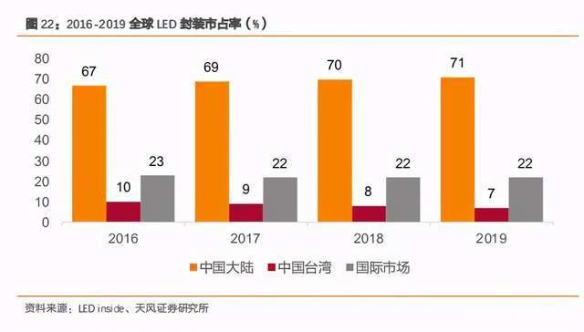 产业转移承接带来封装机遇。中国大陆在近 10 年内承接了全球产业转移,根据 LED inside统计,2019 年中国大陆在全球 LED 封装供给端的市占率达到 71%,海外产能主要聚焦于车用照明等相对高端的市场需求,而通用照明、景观照明、LED 显示和背光等传统应用大部分来自大陆供应商。