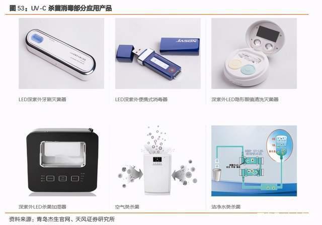 UV-C 杀菌消毒下游应用广阔。UV-C 广泛应用于空气净化、食品及物体表面杀菌、洁净水、医疗及个人护理等领域,未来在家电、公共场所卫生保护等市场潜力较大。