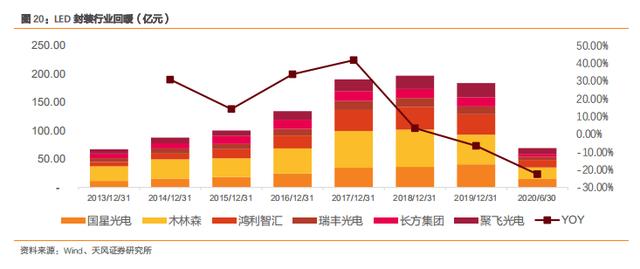 在 LED 封装环节,2020Q2 合计收入为 69.19 亿元,同比下降 22.55%,主要因疫情影响,上半年 LED 封装整体利用率下滑,截至 2020Q2,封装收入占比前三分别为木林森、国星光电和鸿利智汇。