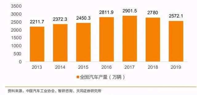 图 69:2013-2019 年全国汽车产量 单位:万辆