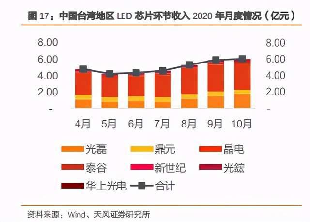 从中国台湾地区 LED 芯片环节来看,我们也能看到月度的环比增长。分季度看,2020Q2中国台湾地区 LED 芯片环节合计收入为 13.35 亿元,同比减少 11.30%;2020Q3,随着 LED行业回暖,收入合计为 15.78 亿元,同比去年增加 0.01 亿元;截至 2020 年 10 月单月,中国台湾 LED 芯片合计收入为 6.02 亿元,同比增加 16.89%。因此,结合中国地区 LED 芯片厂商来看,整体 LED 芯片环节收入景气度逐步回暖。