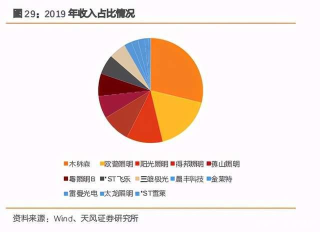 看 LED 照明环节,2011 年 CR5 为 70.52%,2019 年 CR5 为 71.05%,CR3 占比由 44.63%上升为 55.66%,整体集中度向龙头集中。前列企业依旧为欧普、阳光、佛山照明等企业,木林森则通过对下游的垂直整合,收购了海外朗德万斯,成为国内收入占比最高的照明企业。其中 18 年-19 年,收入逆势增长的有木林森、欧普照明、得邦照明、三雄极光、海洋王、晨丰科技、金莱特、雷曼光电。