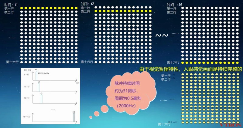 在PM被动驱动方式下,灯珠是逐行亮灭的,一个小的显示区域里,同一时间只有一行灯珠是亮的,其他行灯珠都是灭的。这就好比用一支激光笔快速、反复扫过你的眼睛,太快了,以至于你认为是常亮的,并且灯珠的瞬间峰值亮度可以达到感官亮度的数十倍,所以你会感觉很刺眼,即使LED屏的亮度调得很低。