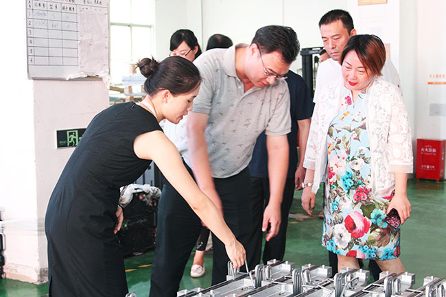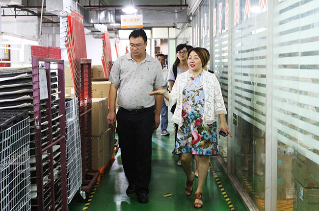 龙平芳女士陪同民众镇副镇长李建华先生参观生产车间。