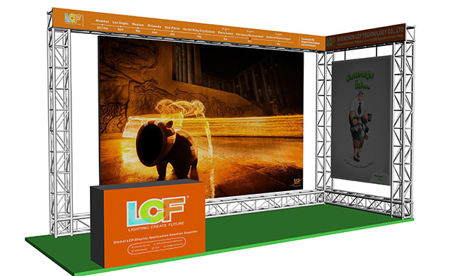 参展产品:室内P2.604压铸镀膜屏,户外P8前维护大屏,户外格栅屏P15.625,P16户外前翻盖大屏