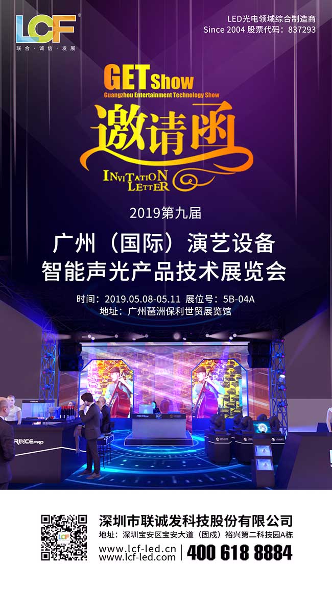 5月8日-11日,第九届广州(国际)演艺设备、智能声光产品技术展览会(简称“GETshow”)将在广州琶洲保利世贸博览馆盛大开幕!本届展会,LCF视觉创造团队将携最新推出的声光电一体化舞美解决方案与大家见面!在此,诚邀五湖四海新老朋友、客户莅临5B-04A参观指导、洽谈合作!