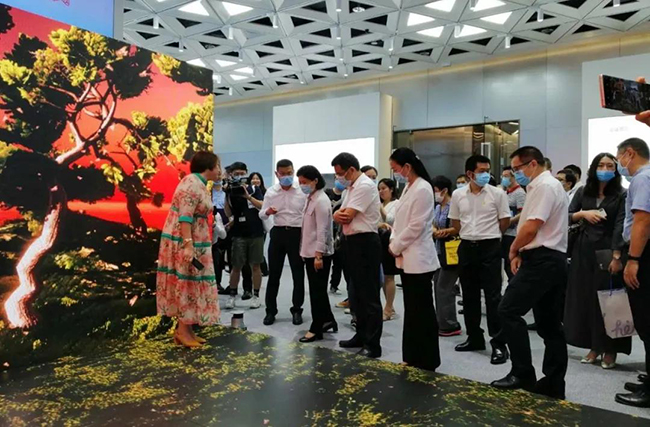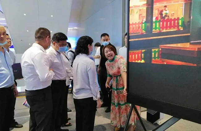 304AM永利总裁龙平芳女士亲自向各位领导讲解了304AM永利的企业定位,以及现场的两款核心产品;其中之一,“沉浸式互动视觉场景”是基于LED显示屏+3D互动数字技术,形成沉浸式视觉场景,主要应用与电影拍摄,文旅,夜游等领域;实现这种沉浸式显示体验,除了需要高端的屏幕显示技术,亦需要内容产业能够提供充分的制作、计算和存储能力。它融合了VR/AR、计算机多媒体技术,视觉内容,呈现新的“显示概念高地”。宝安区郭子平区长现场表示“想不到航城还有这样的好企业,要好好支持!”